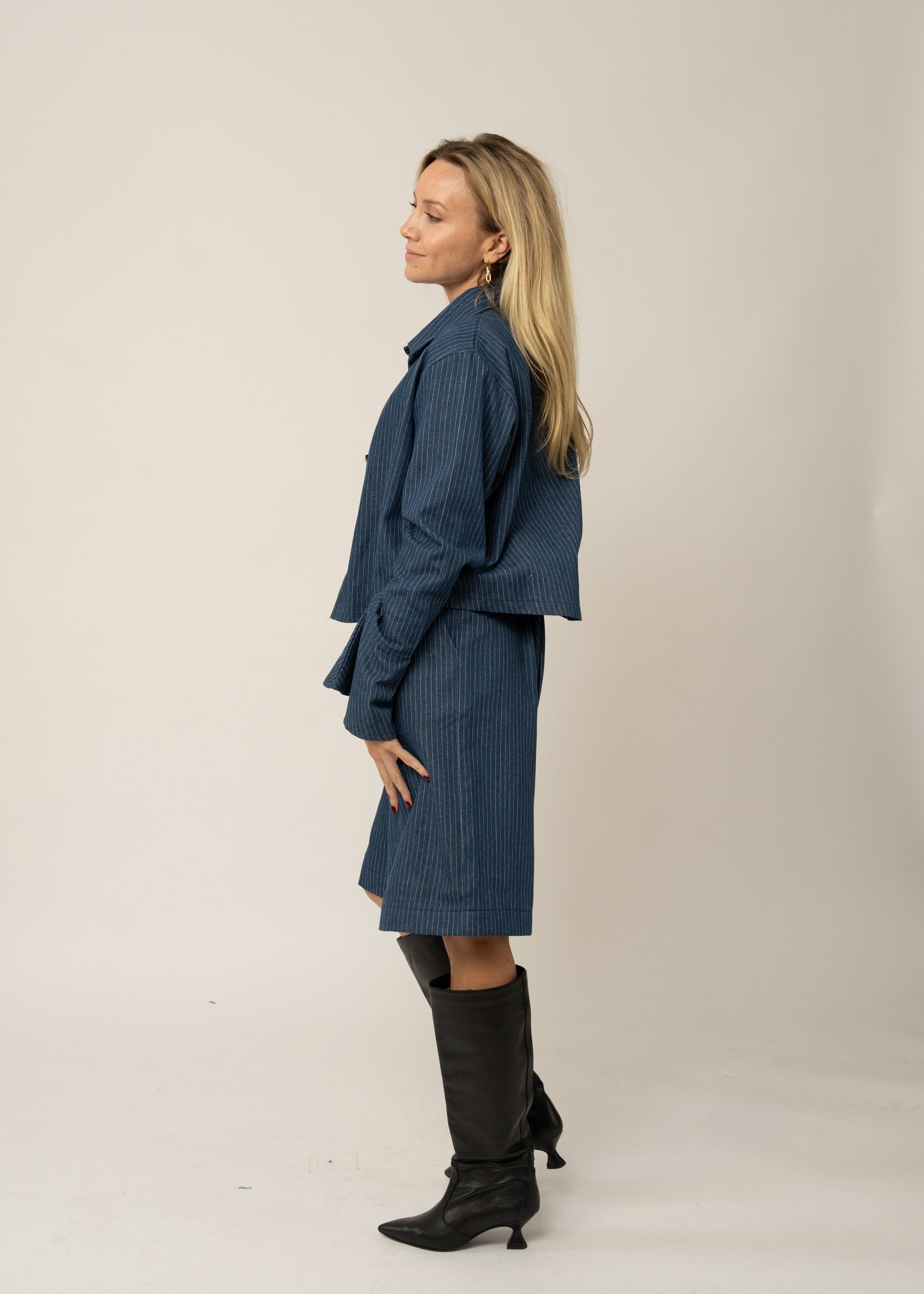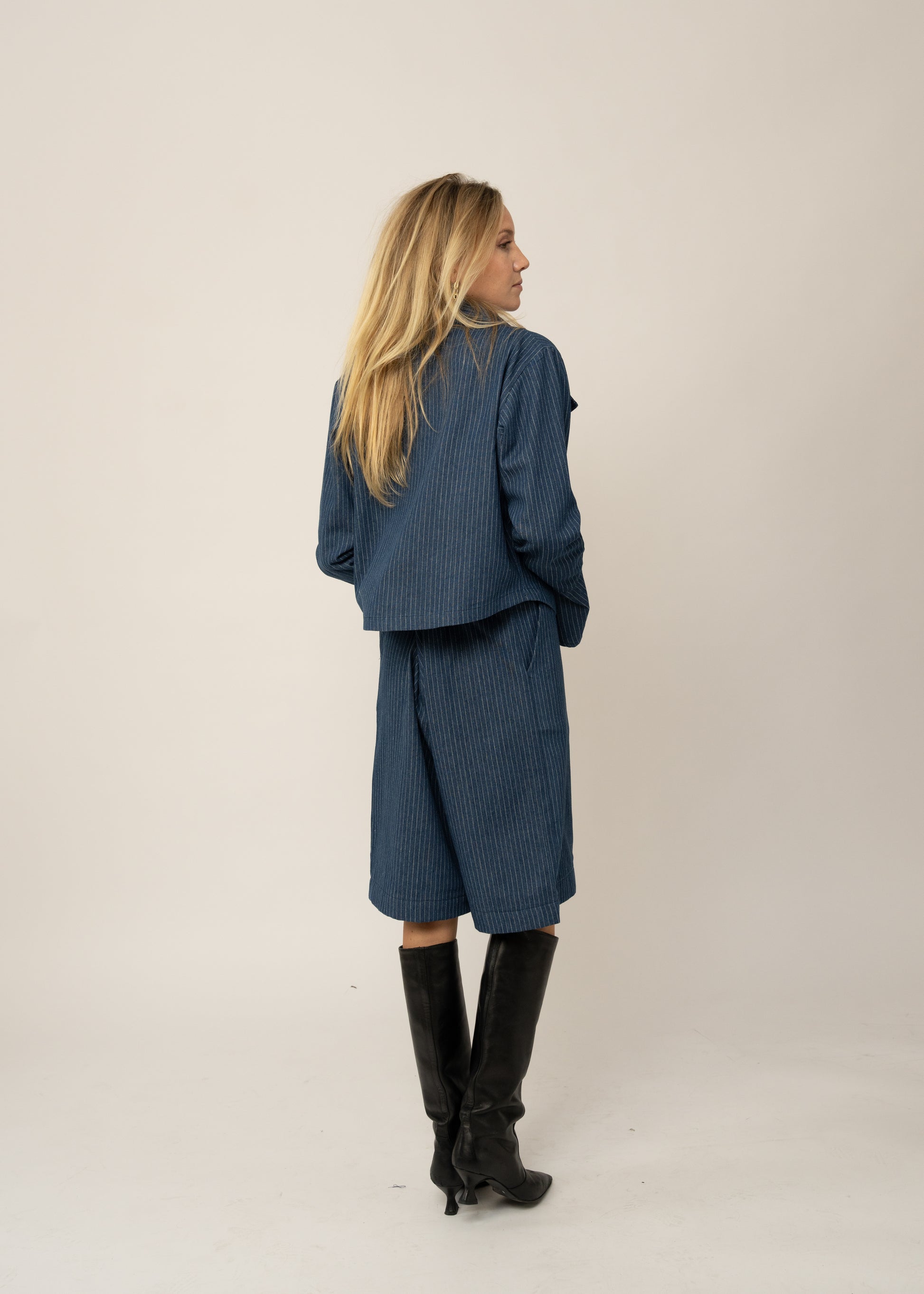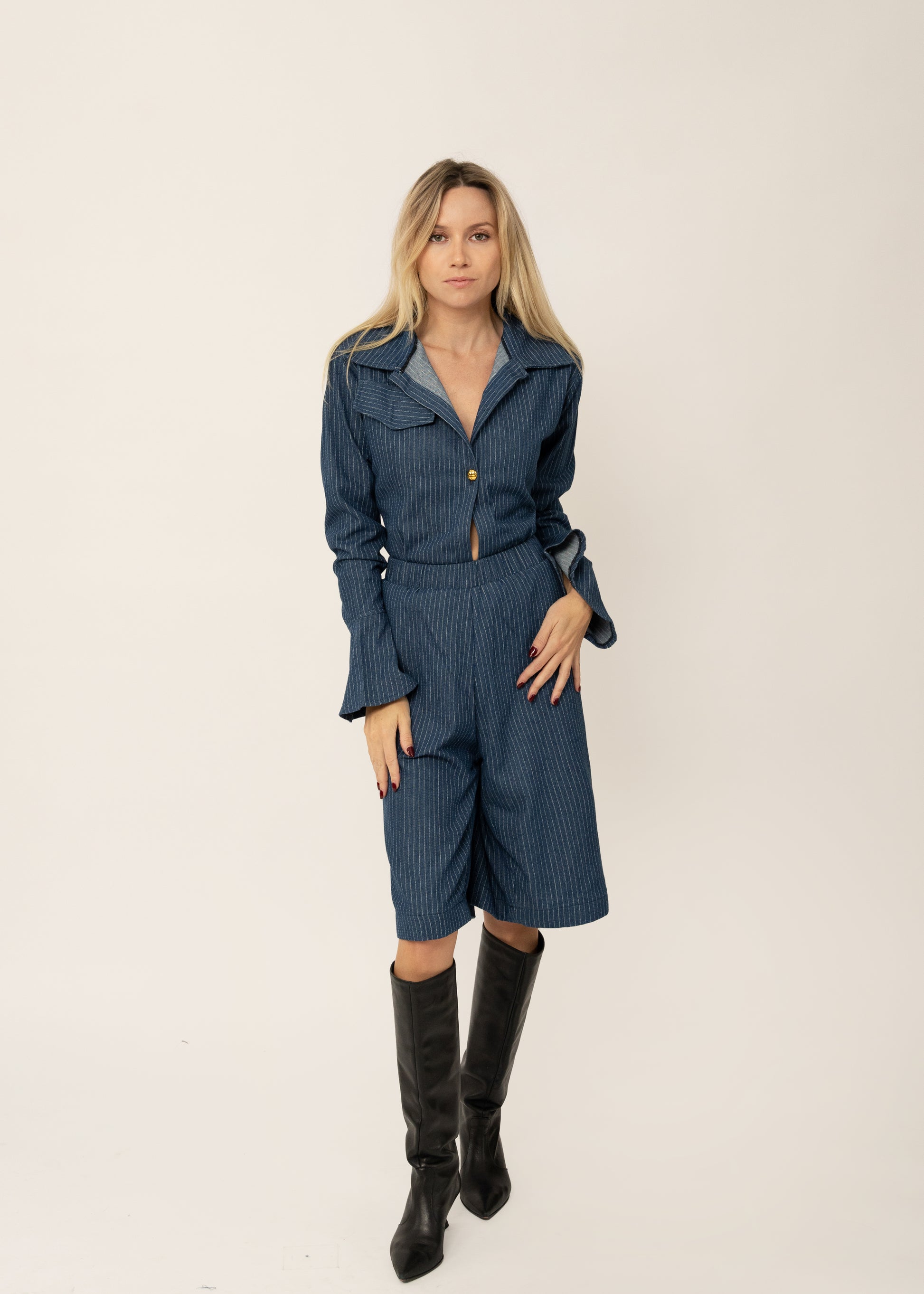 A versatile striped denim duo featuring Bermuda shorts and an open jacket with a gold button. Wear it your way — open, buttoned, tucked, or half-tucked — for endless styling options. Perfect paired with high leather boots for an easy, elevated look.
