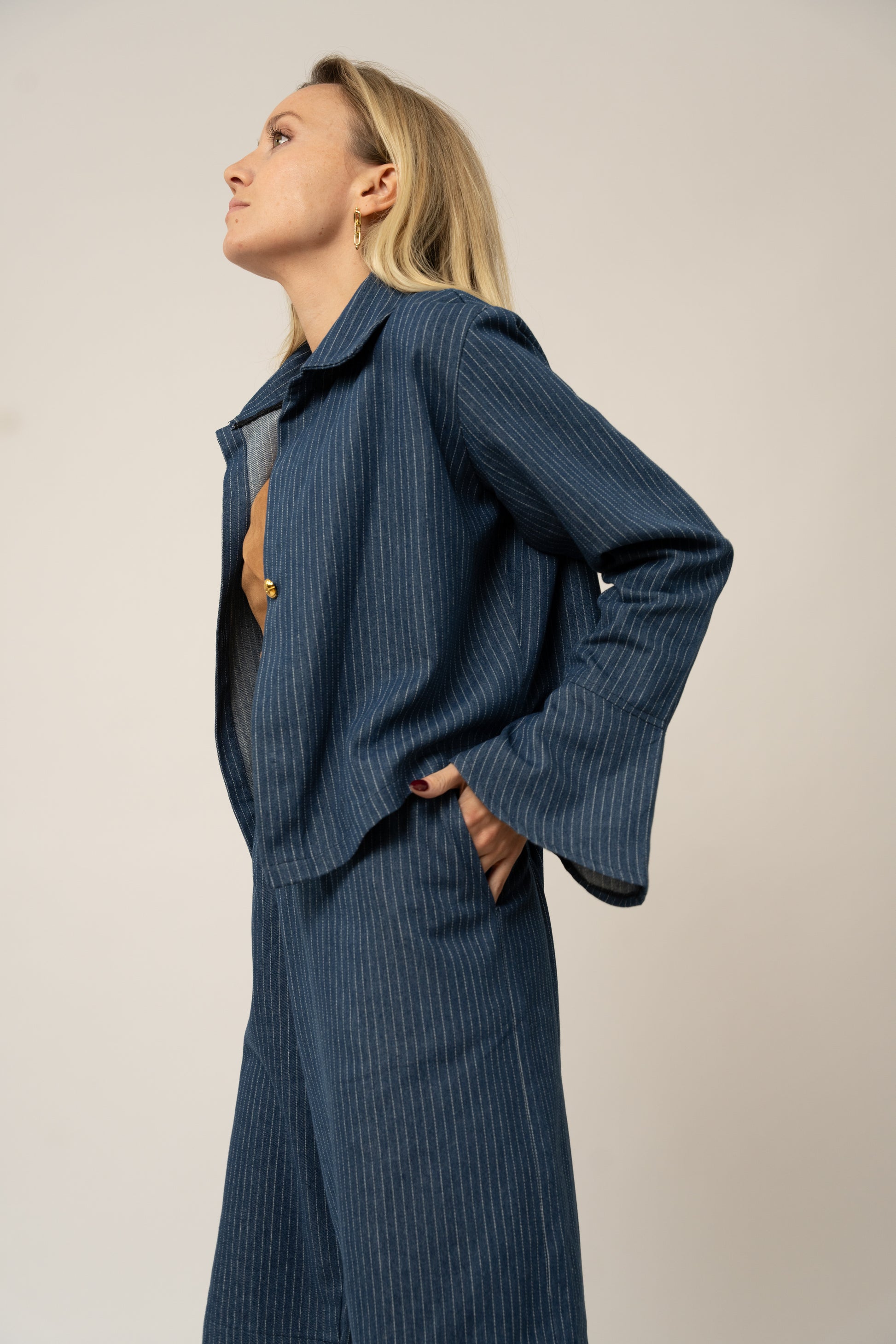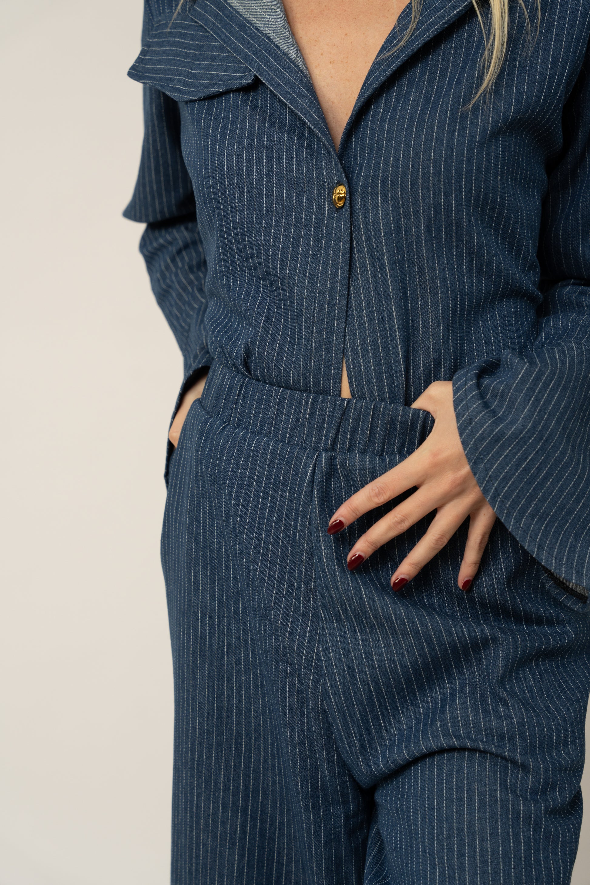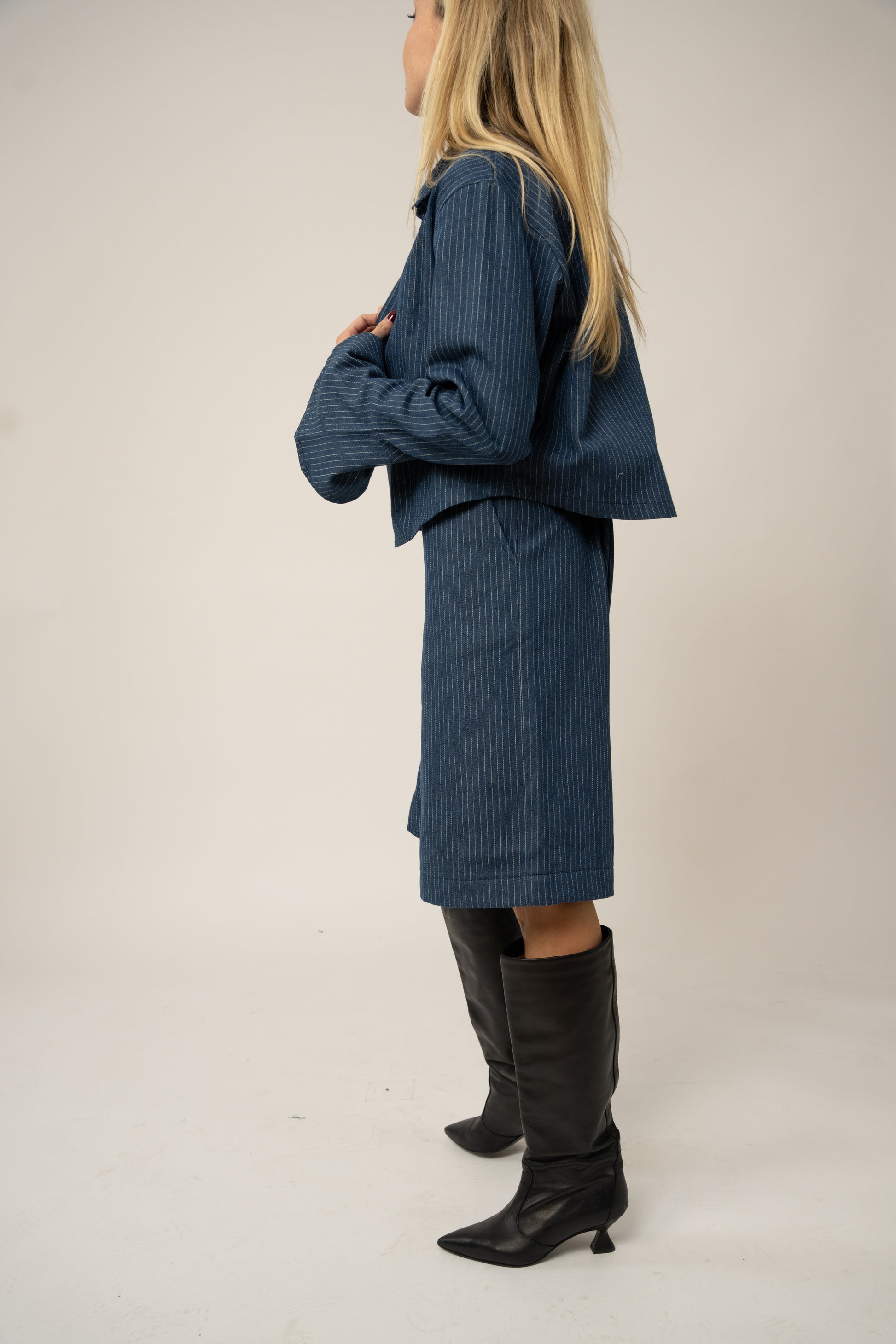 A versatile striped denim duo featuring Bermuda shorts and an open jacket with a gold button. Wear it your way — open, buttoned, tucked, or half-tucked — for endless styling options. Perfect paired with high leather boots for an easy, elevated look.