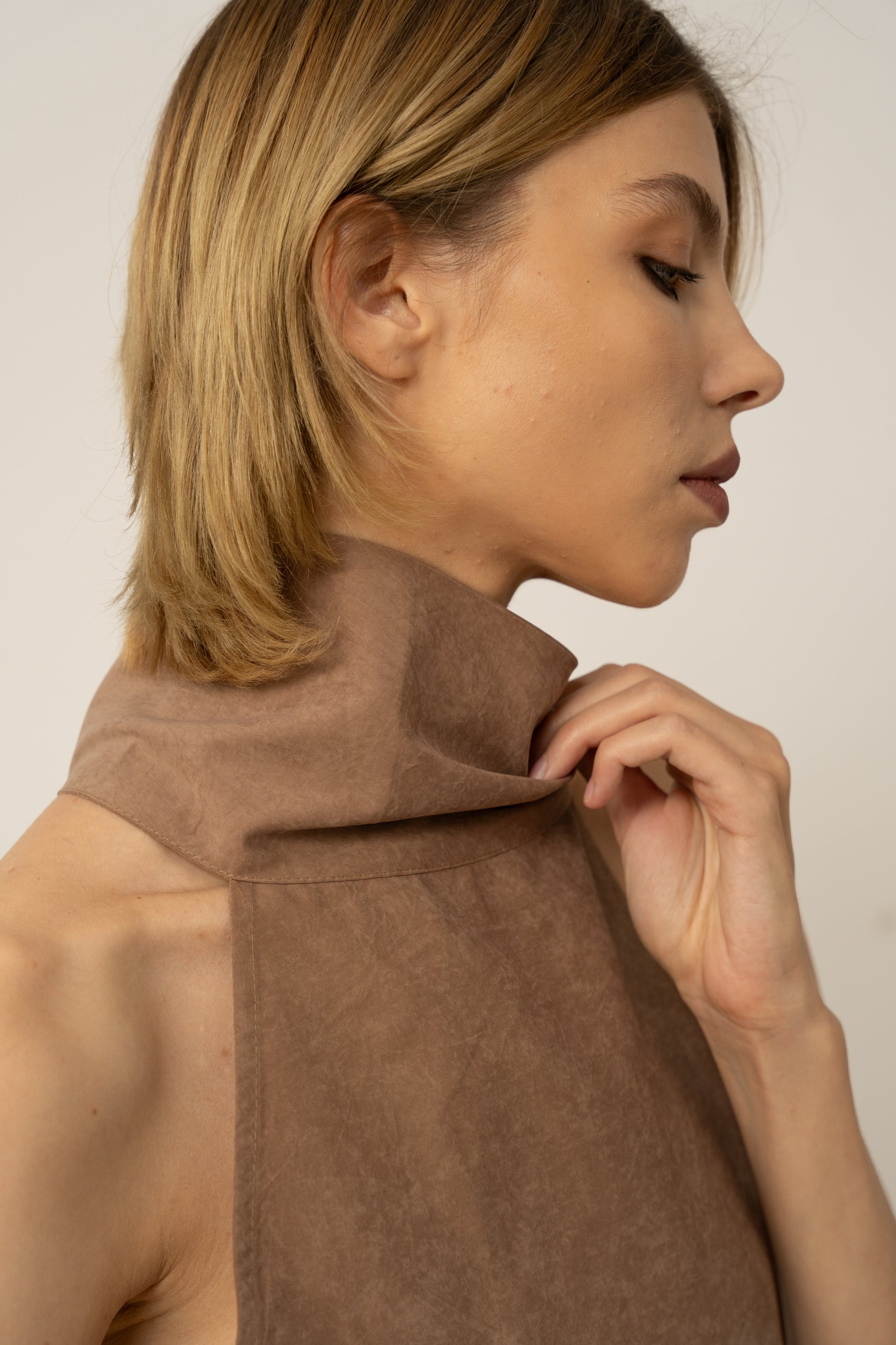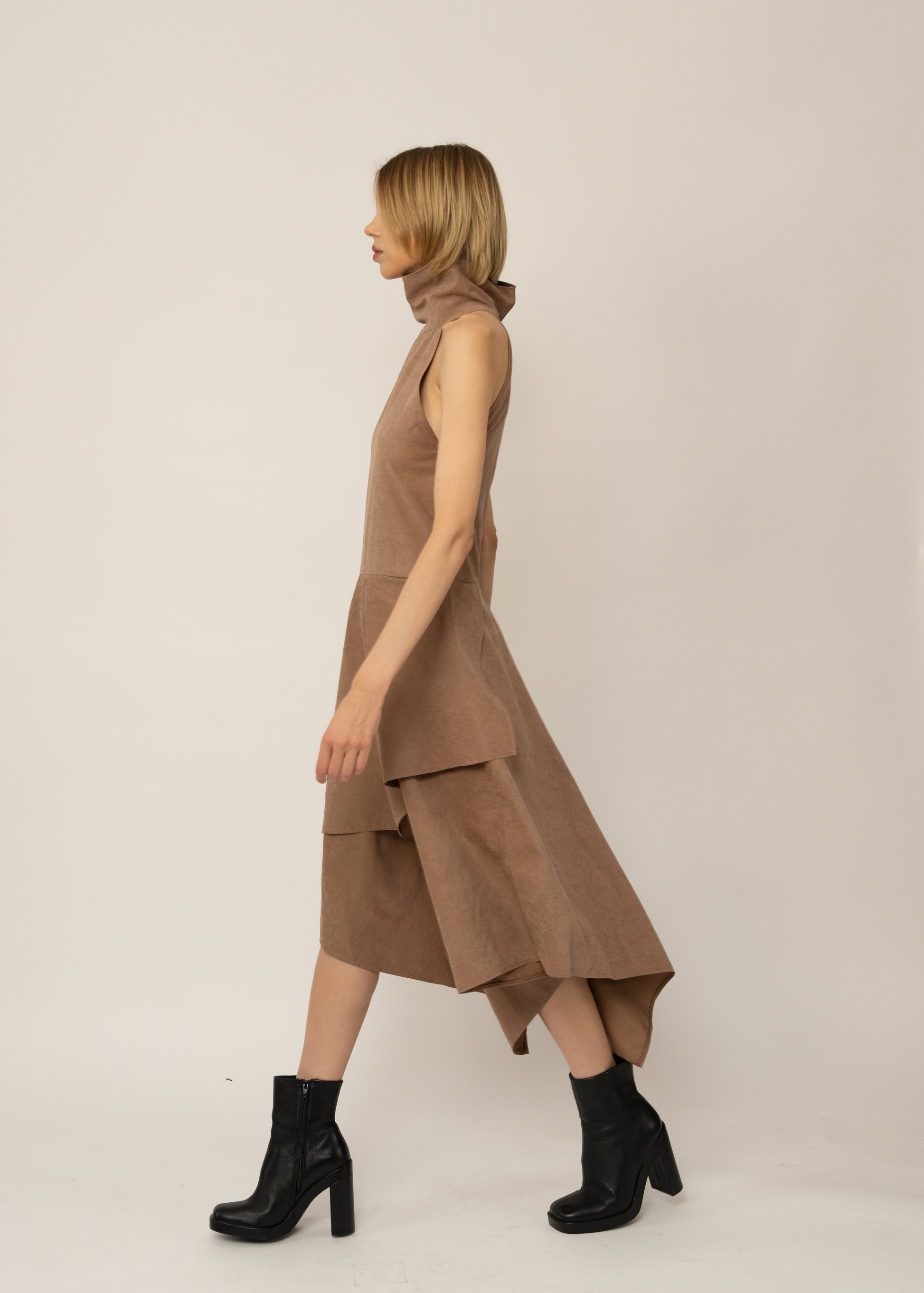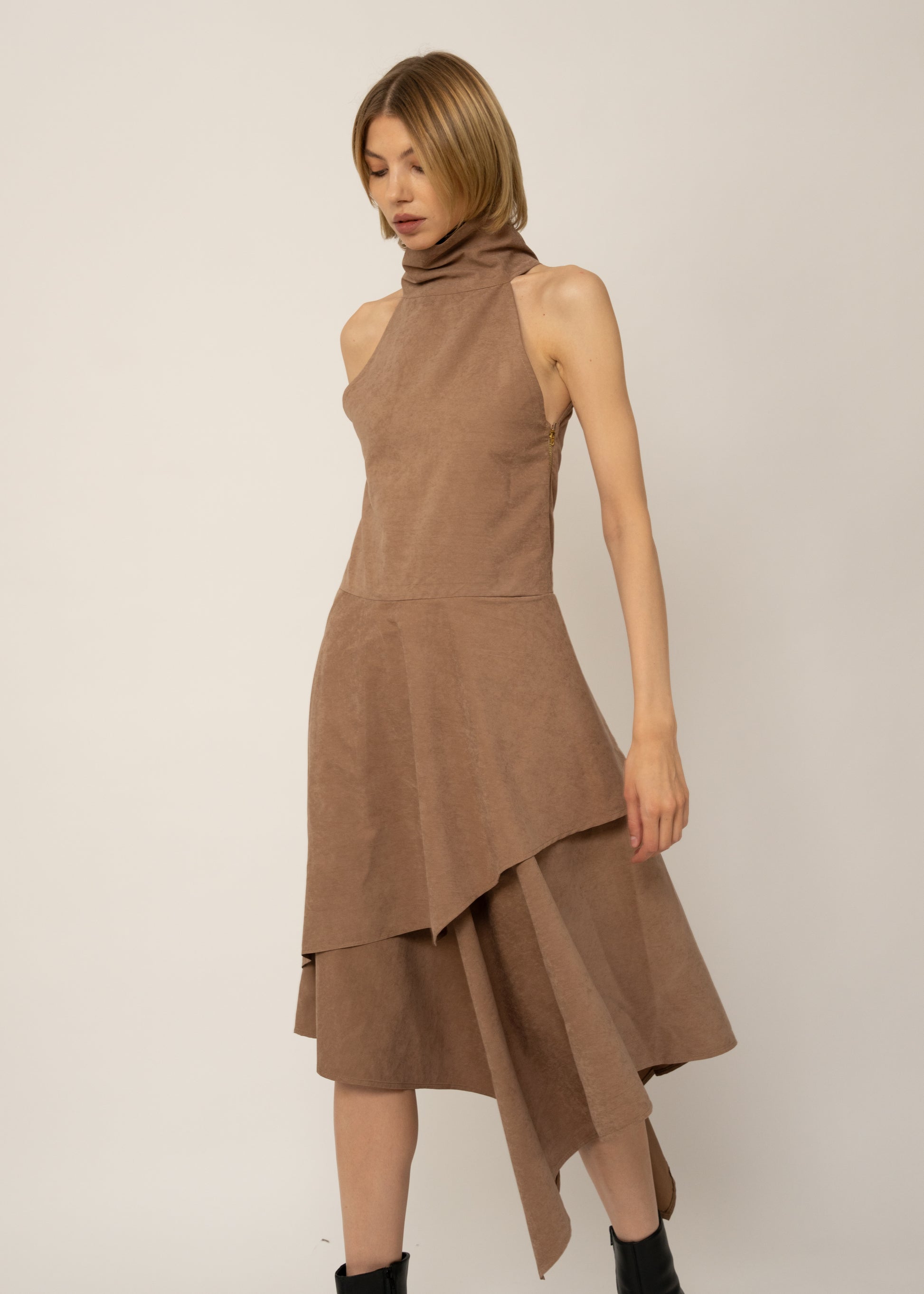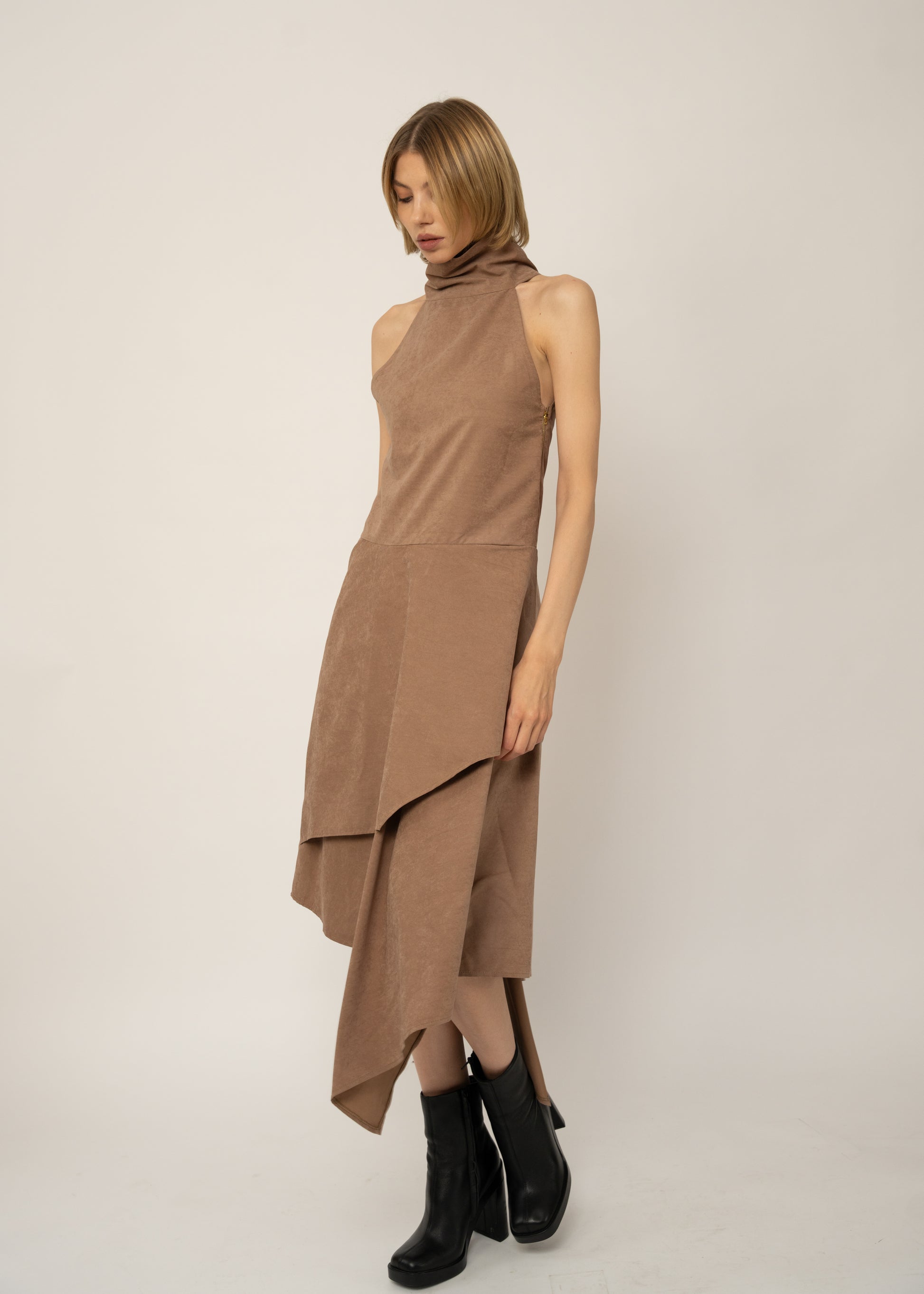 A suede-silk finish dress with a loose high turtleneck, gold zips at the hips, and layered asymmetric hems. Chic, fluid, and unmistakably unique.