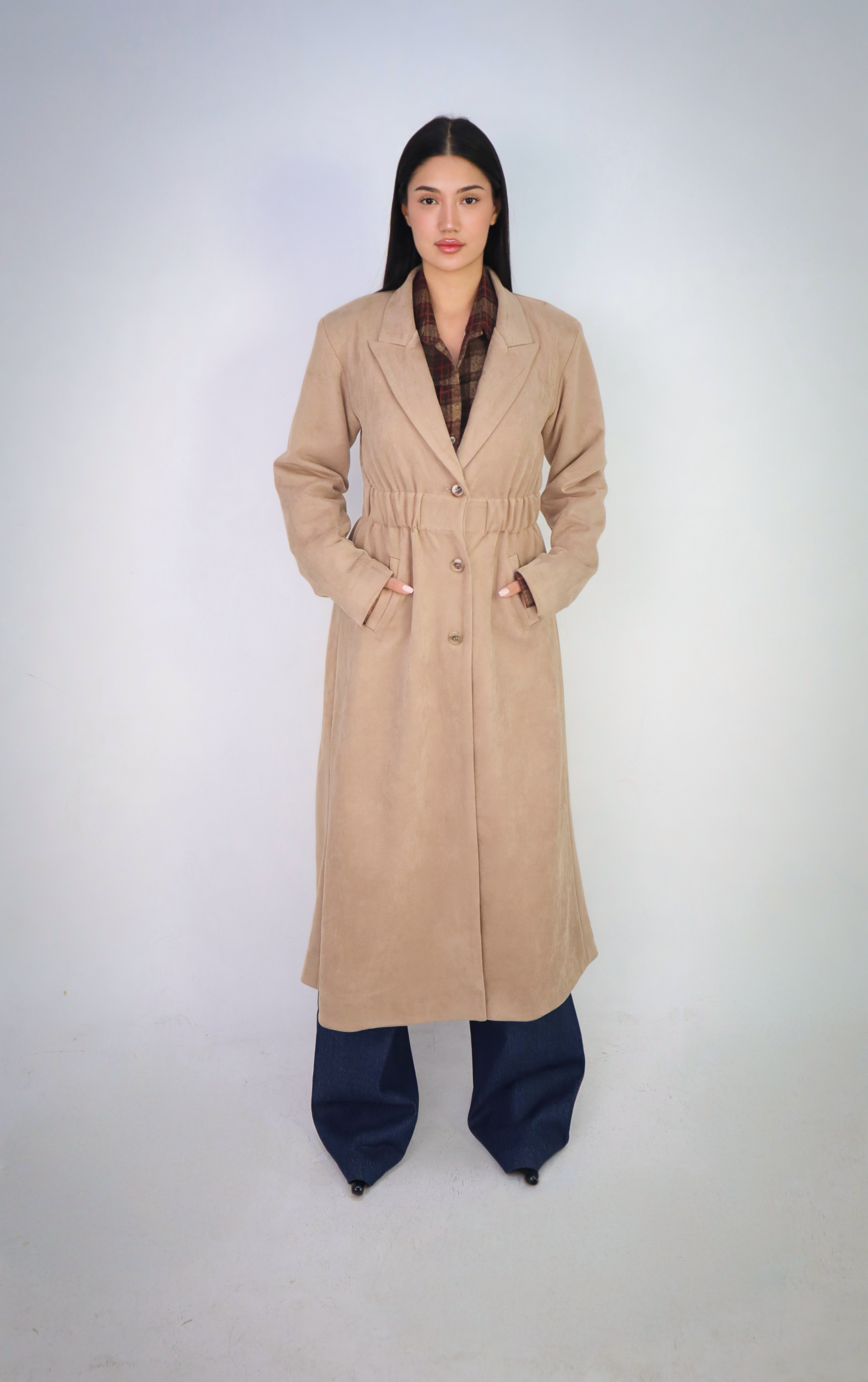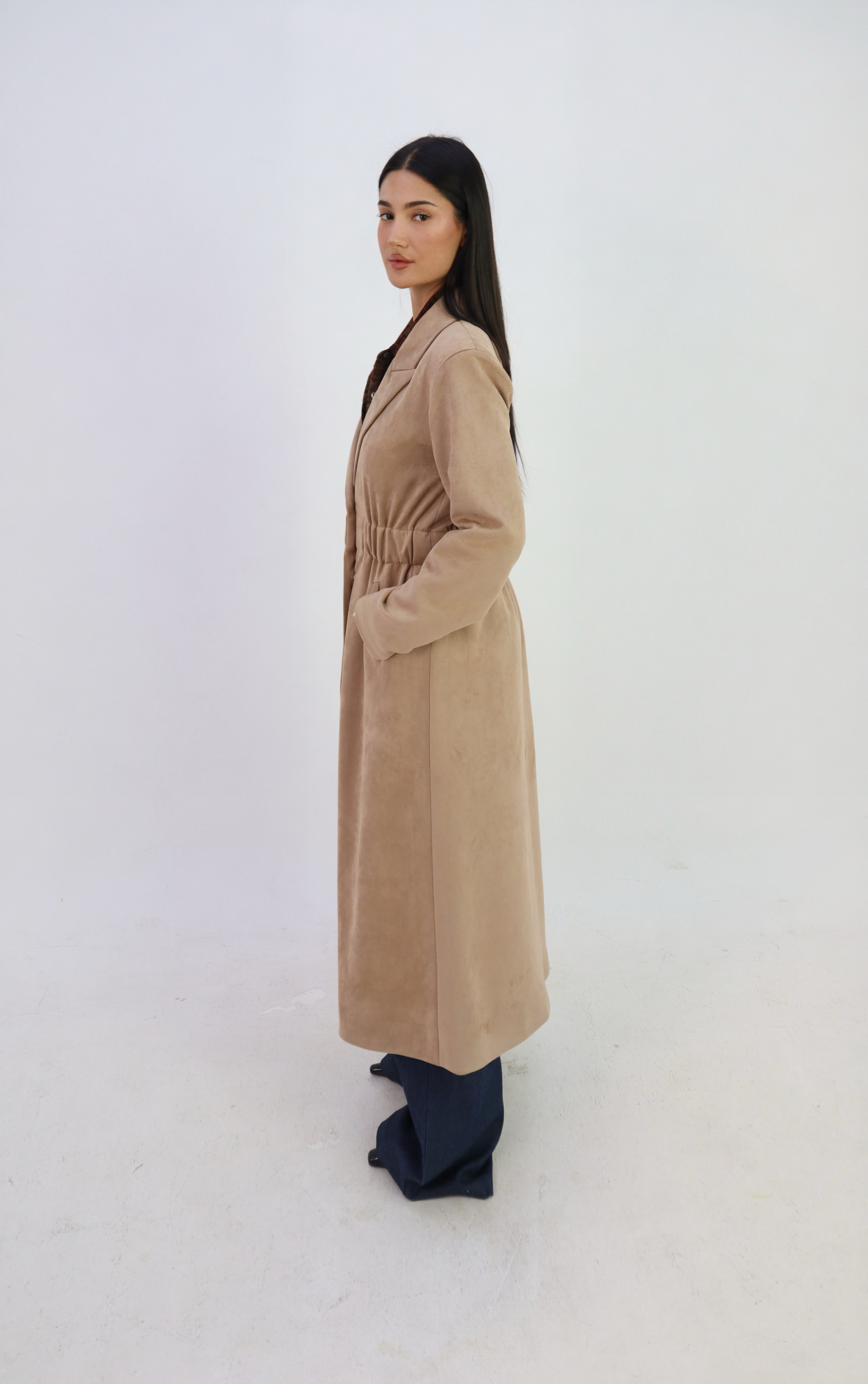 Tailored from soft faux suede, this trench coat redefines timeless outerwear with a cinched waistline and clean button-down front. Designed in a warm camel hue, it drapes elegantly over any look, blending structure and femininity for a refined silhouette.