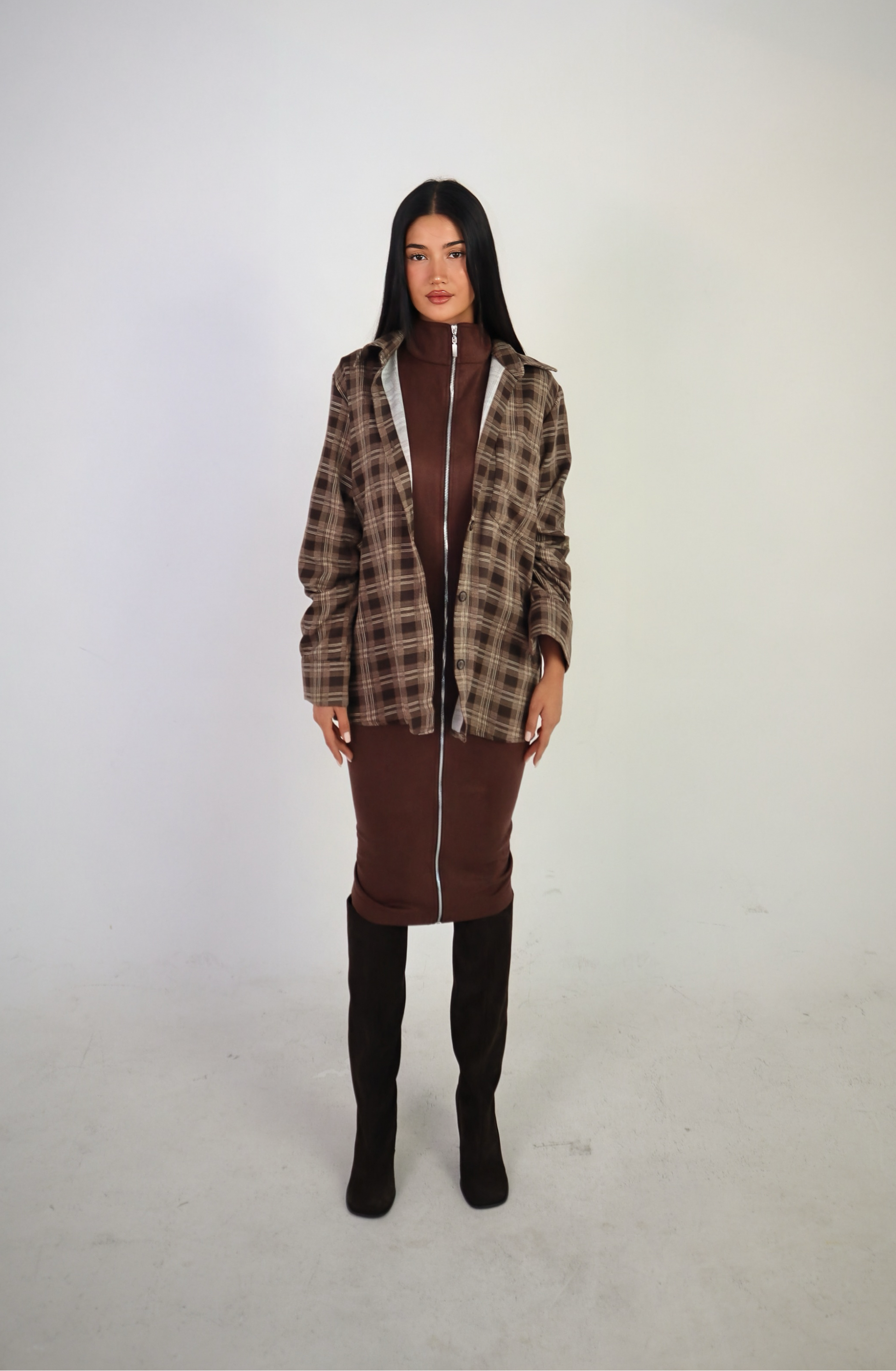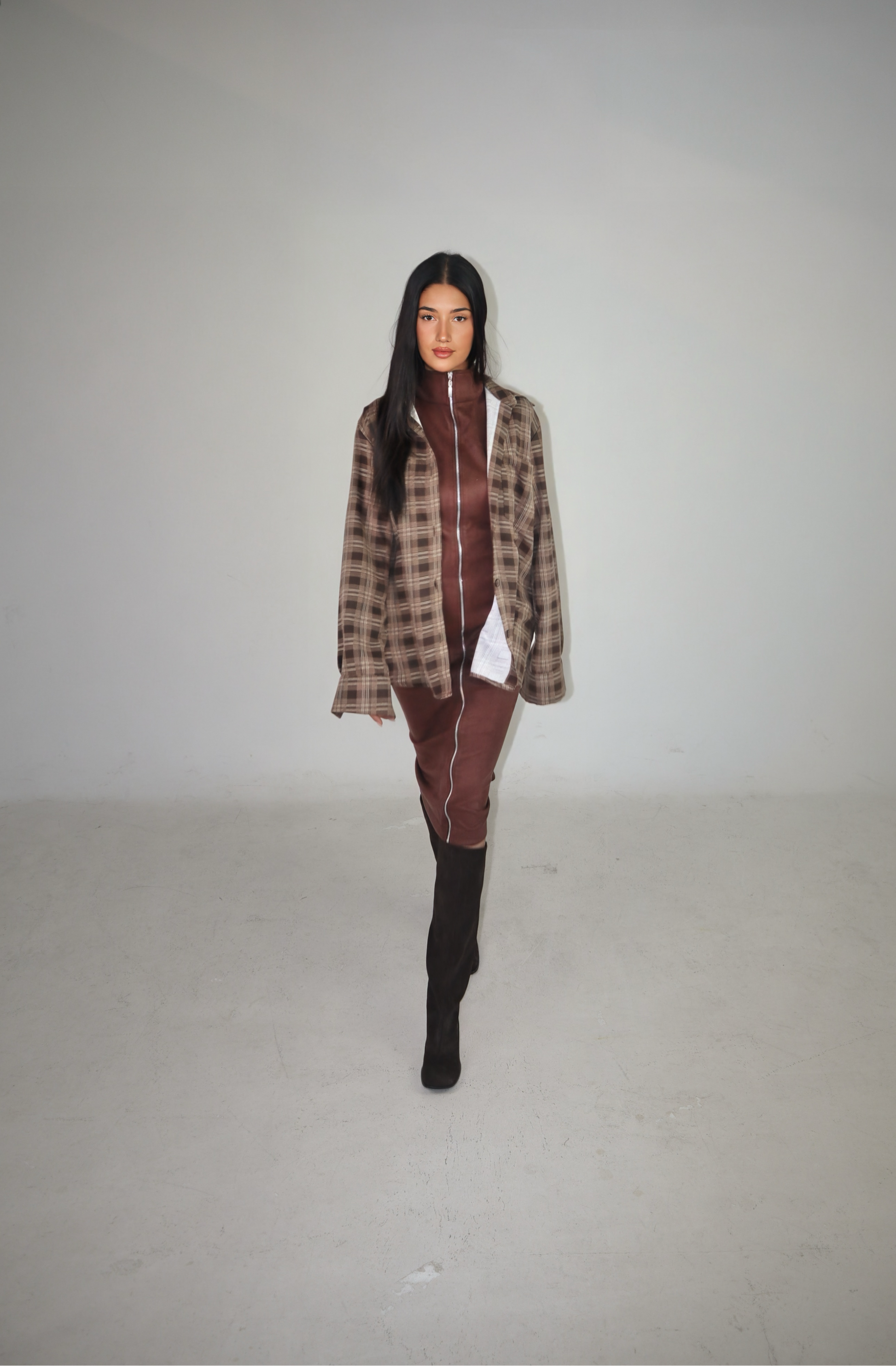 A fitted zip-front dress in soft brown suede layered with a lightweight plaid overshirt. The contrast of textures creates a contemporary interplay between elegance and ease — a perfect transitional look for cooler days.